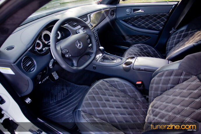 Custom Carbon Fiber Door Caps/ Finishers (First Ever on CLS), Brabus Brushed Aluminum Pedal Set , Brabus Chrome Door Pins, Custom CF Interior Trim , Custom Carbon Fiber Dash, Custom Carbon Fiber Dash Panels,, Custom Carbon Fiber Shifter Gate, Custom Carbon Fiber Rear Slide Accordions, Custom CF Front Seat Back (First Ever on CLS), Custom Double Diamond Stitched Front Seats (Alcantara), Custom Double Diamond Stitched Rear Seats (Alcantara), Custom Double Diamond Stitched Front Seat Magazine Pockets (Alcantara), Custom Double Diamond Stitched Door Panels (Alcantara), Custom Double Diamond Stitched Door Pockets (Alcantara), Alcantara Wrapped A, B, and C Pillars, Alcantara Wrapped Rear Deck, Alcantara Headliner, Alcantara Shift Boot w/Stitching, Mercedes CLK 63 AMG Black Series Steering Wheel w/ Aluminum Paddle Shifters