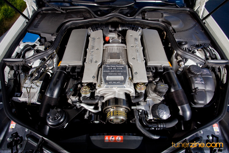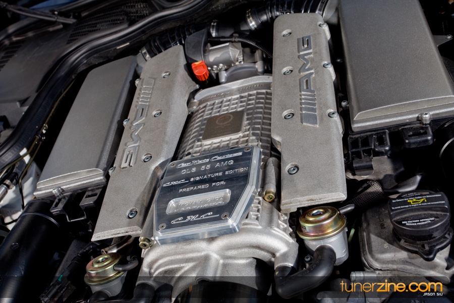 A first glance at the engine bay reveals that it means business. The custom Carnutz plaque hides a plethora of EvoSport Evolution power goods. EvoSport’s Evolution 1 and Evolution 2 power packages have been thrown onto Mike’s CLS55 bringing horsepower from a tame cruiser to a real street bruiser. The Evolution 1 power package comprises of a series of lightened pullies, and ECU software. The Evolution 2 power package is what makes this CLS55 breathe freely: “shorty” performance headers along with 8mm spark plug wires and more aggressive ECU tuning. Their cooling package along with their 80mm throttle body upgrade gives a ton of extra flow for this supercharged V8 beast.