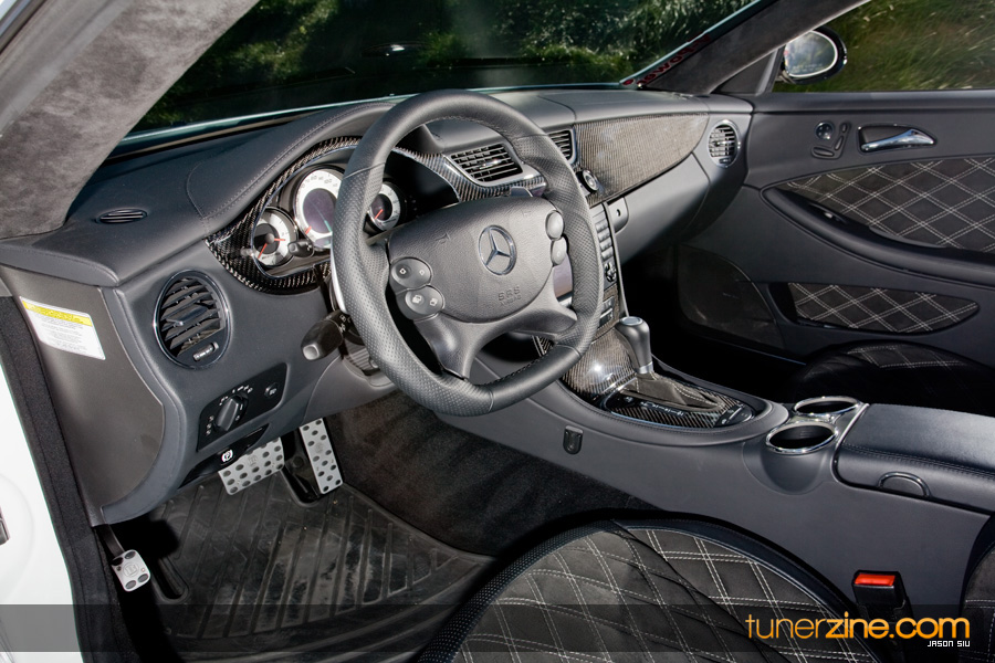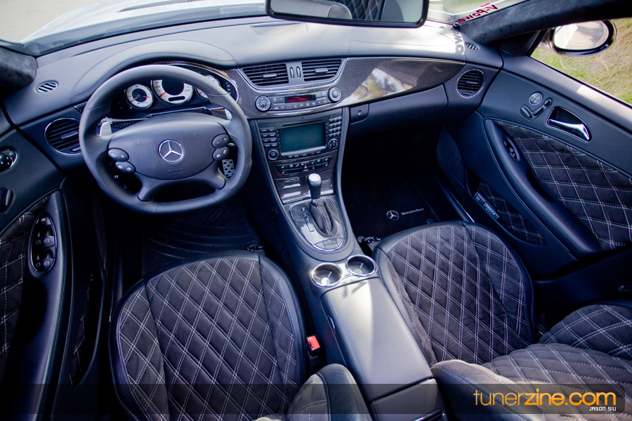 Custom Carbon Fiber Door Caps/ Finishers (First Ever on CLS), Brabus Brushed Aluminum Pedal Set , Brabus Chrome Door Pins, Custom CF Interior Trim , Custom Carbon Fiber Dash, Custom Carbon Fiber Dash Panels,, Custom Carbon Fiber Shifter Gate, Custom Carbon Fiber Rear Slide Accordions, Custom CF Front Seat Back (First Ever on CLS), Custom Double Diamond Stitched Front Seats (Alcantara), Custom Double Diamond Stitched Rear Seats (Alcantara), Custom Double Diamond Stitched Front Seat Magazine Pockets (Alcantara), Custom Double Diamond Stitched Door Panels (Alcantara), Custom Double Diamond Stitched Door Pockets (Alcantara), Alcantara Wrapped A, B, and C Pillars, Alcantara Wrapped Rear Deck, Alcantara Headliner, Alcantara Shift Boot w/Stitching, Mercedes CLK 63 AMG Black Series Steering Wheel w/ Aluminum Paddle Shifters