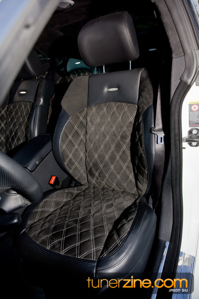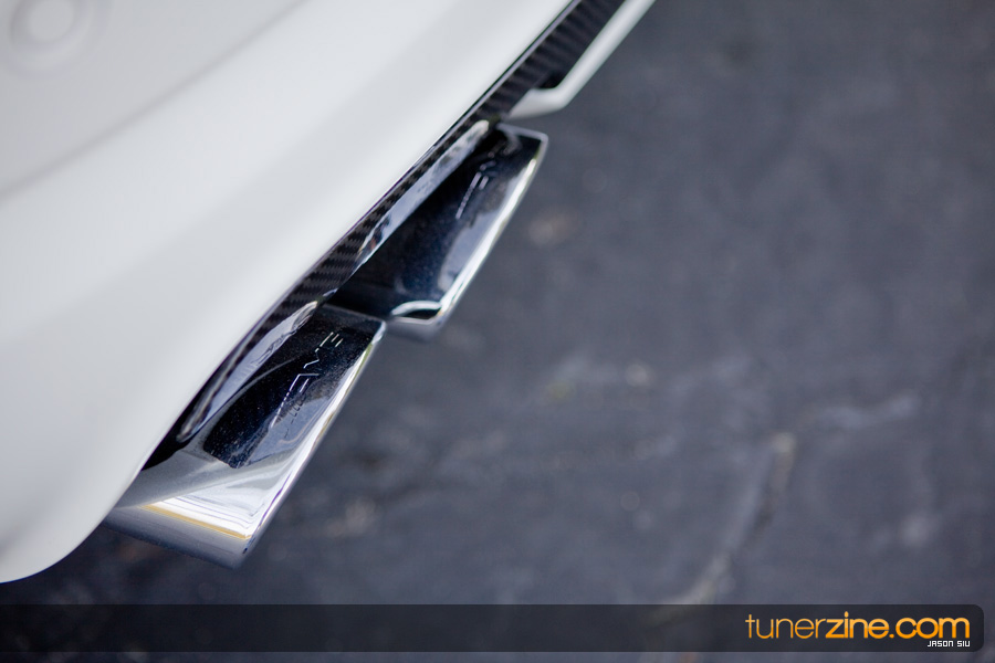 But back to the more important topic at hand here – that is, Mike Chou’s CLS 55 AMG built by Carnutz Customz. Getting the itch of building a luxury European much like his TWCompetition brethren, Mike departed from his IS300 to cruise the streets in this menacing CLS. We’ll be the first to admit that most European tuned vehicles are content with suspension, wheels/tires and a simple kit – but Mike’s CLS goes way beyond that. In fact, the outside’s combination of Brabus and carbon fiber styling really sets the tone for the rest of the build. Many of these carbon fiber pieces, especially those seen on the front bumper, were the first ever built on a CLS, incorporating and accenting the Brabus Rocket front bumper. A Brabus Rocket vented hood along with hood grills flow into the carbon fiber three-slat grill. The side of the vehicle is unmistakably Brabus’ Rocket side skirts along with carbon fiber B-pillars and carbon fiber mirrors. The rear sports a carbon fiber CLS55 AMG diffuser along with custom rear diffuser puddle lights. The rear deck lid spoiler has been kept clean and simple with a piece from AMG. What really sets this CLS off however is the full carbon fiber roof. First ever on a CLS and we have to say it really makes this CLS one-of-a-kind.