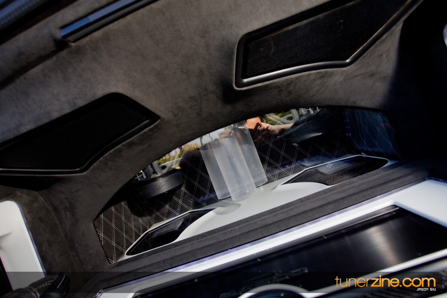 The extensive modifications don’t stop there as we take a look inside the car. Additional carbon fiber goods along with Brabus amenities can be seen throughout the cockpit. Brabus’ brushed aluminum pedal set and chrome door pins accent the custom Alcantara-wrapped double diamond stitched interior. The Alcantara theme continues throughout the interior with the door panels, pillars, rear deck and door pockets receiving the same treatment. In car entertainment doesn’t lack one bit either. A quick pop of the trunk and a sneak peek reveals not only some of the most beautiful work we’ve ever set our eyes on, but a beautifully sounding system full of entertainment. A pair of Image Dynamics IDQ subwoofers is housed in a custom ported enclosure that has been wrapped with suede and sports a frosted glass port with LED illumination. Car shows are a little more entertaining with a Wii system installed along with a trio of monitors. A pair of Zapco digital amplifiers powers the Image Dynamics component speakers, tweeters, Coaxials and subwoofers.