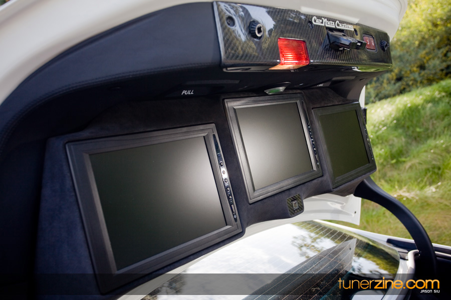 (2) Image Dynamics IDQ Subwoofers 12″, Image Dynamics Component Speakers , Image Dynamics Tweeters, Image Dynamics Coaxial, (2) Zapco Digital Amplifiers, Custom Mounted Zapco Digital Processor (Motorized), Varad LED lighting / light panels, MPI-400 Power Inverter , Custom Carbon Fiber Amp Enclosure, Color Matched Painted Fiberglass Enclosures, Custom Carbon Fiber Trunk Trim / Trunk Closer, Napa Leather Wrapped/ Stitched Trunk Panels, Alcantara Wrapped Trunk Panels, (2) Savv 7″ Headrest Monitors w/ wireless headphones , (3) 10″ LCD Monitors in the Trunk lid, Custom Installed Nintendo Wii, Custom Fiberglass Work in the Trunk and Trunk lid, Carbon Fiber and Double Diamond Suede Ported Subwoofer Box, Frosted Glass Port w/ LED Illumination, Full Dynamat lining in the Trunk, Savv Reverse Camera, Custom Carbon Fiber Camera Enclosure, Custom Double Diamond Stitched Wii Controller Case, DVD Player, Nav TV Modified Head Unit / Video in Motion, iPod / iPhone Integration