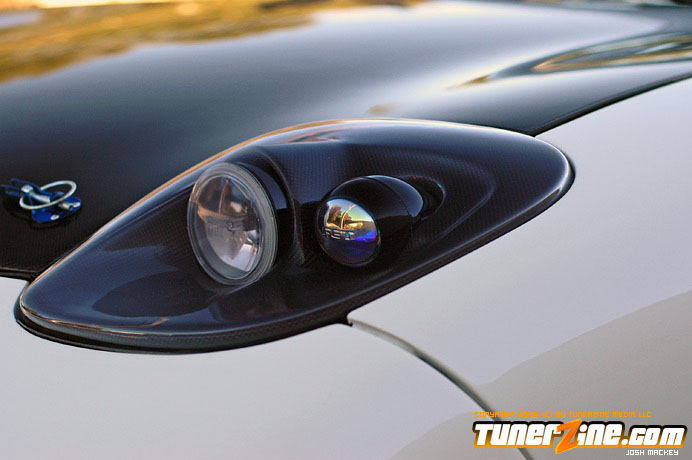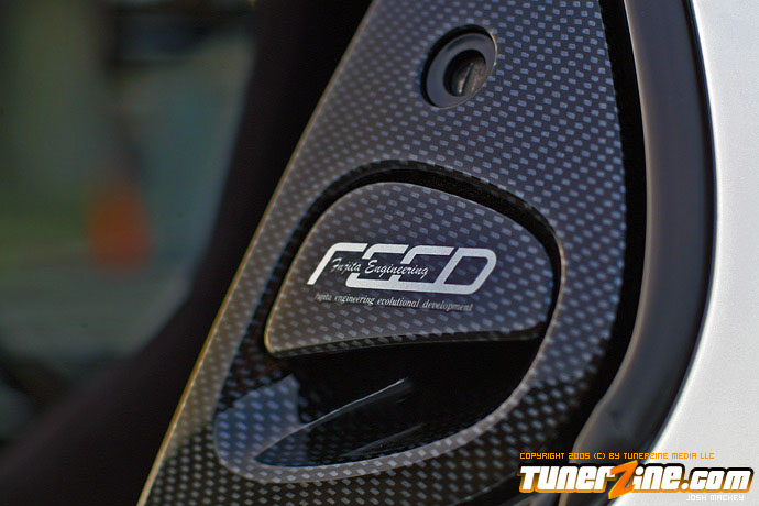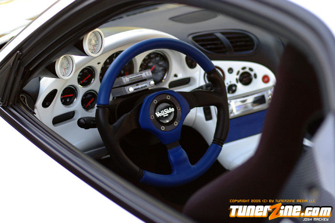 On the exterior, it’s hard to mistaken this RX-7 for any other. The entire body has been resprayed a white shade with a mixture of blue pearl. An entire C1 Veilside body kit has been installed along with the side and rear skirts molded onto the body. Tossing away the stock mirrors for more stylish Craft Square Carbon GT units, the carbon fiber shade didn’t stop there with the addition of a C-West carbon GT wing. Up front a lighter carbon fiber hood found its way on the hinges and in the rear is a set of RE Amemiya carbon diffusers. The stock pop up headlights have been replaced for a more modern set of C-West units, and the rear taillights were swapped for JDM round units.