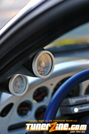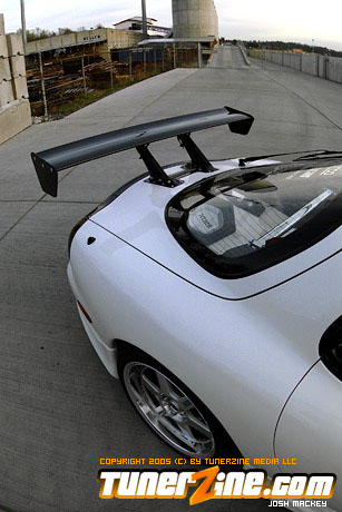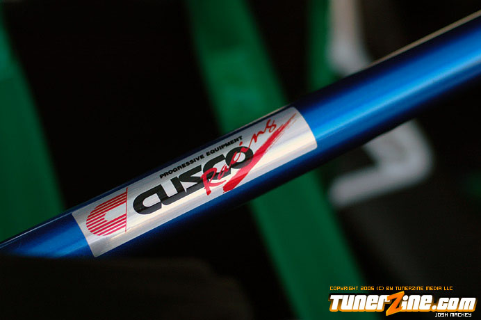 Focusing first on the rotary engine setup, Pettit Racing Hybrid Hi-flow turbochargers replaced the stock units. An Efini turbo outlet connects to an HKS downpipe and through a Bonez hi-flow cat converter which dumps everything out of an HKS Carbon TI exhaust system. The upper and lower intake manifolds were removed and ported which receives fresh air from the Blitz dual core intake system. A Blitz blow off valve can be heard in between shifts while this 13B powered RX-7 rolls around. A GReddy intercooler upgrade complete with intercooler pipes was outfitted onto this RX-7 to give it the menacing grin it so deserves. Helping keep the fuel in tuned is a Cosmo fuel pump and A-RF fuel pressure regulator. In the drive train, a pair of RP goodies found their new home: RP carbon driveshaft and RP final drive gear (4.33 ratio). Before you shut the hood though, it’s hard to miss the bright blue GReddy pulley kit, oil cap and the Blitz radiator cap.