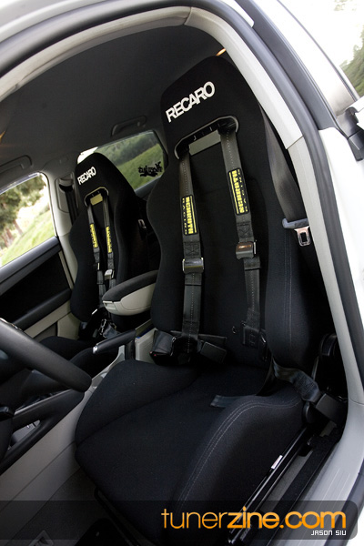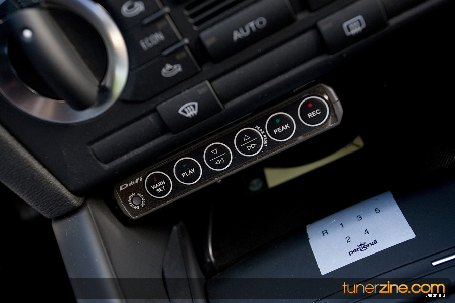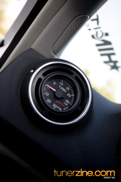 Managing to get our way and inside the A3, we were relieved to find its received its fair share of upgrades as well. The stock seats are long gone and in the front are its replacements: a pair of Recaro Speed seats. Schroth Racing harnesses can be seen draped over these cushioned luxuries. To match the rest of the interior, Leon had the rear seats rewrapped with Recaro fabric as well as the door panel inserts. German manufacturer Oettinger provided the all new door seals. Gauges then found their way into the interior thakns to AWEtuning’s custom vent gauge and DEFi’s control unit. Currently boost and EGT can be seen from Leon’s cockpit. Last but not least, the stock shift knob has been tossed for a Personal piece.